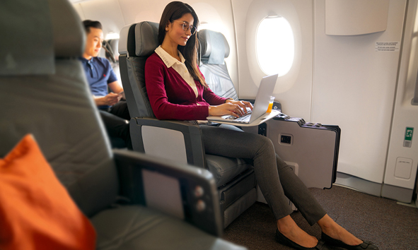 Transformasi SIA tidak berhenti di darat. Di udara, maskapai ini kembali meningkatkan standar Premium Economy Class melalui pembaruan menyeluruh yang mulai berlaku pada seluruh penerbangan jarak jauh sejak 31 Maret 2024. Penumpang kini disambut dengan champagne premium setelah lepas landas, menu lengkap dengan lebih dari 200 pilihan hidangan baru, serta peralatan makan porselen eksklusif.